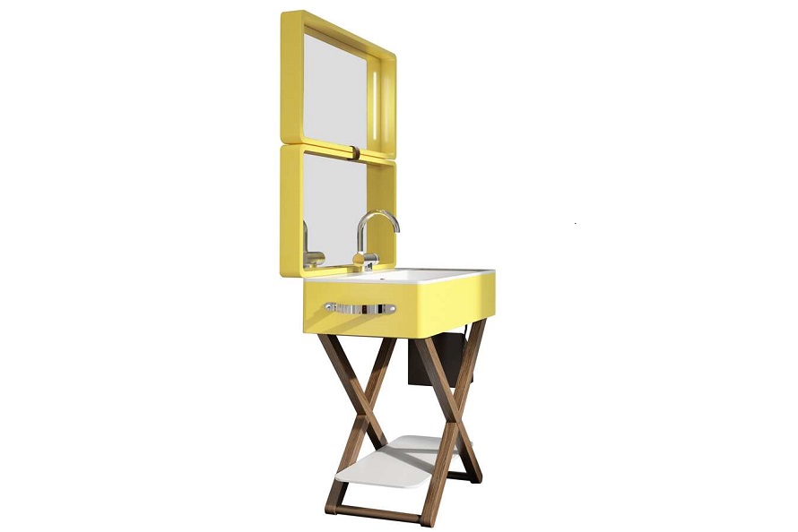 Oglinda de perete, echipată cu un sistem de lumină LED, completează lavoarul și capacul și este disponibilă într-o varietate de culori - alb, verde, turcoaz, galben sau wengè. Lavoarul este incastrat într-un mobilier ce are forma unei valize, subliniind și mai mult conceptul de 'geantă de călătorie'. Mânerul bagajului, în finisaj cromat, devine suportul pentru prosop. Iar cadrul din lemn, ce se poate alege dintre wengè sau frasin, îmbrățișează aceste elemente, la fel cum o geantă de călătorie încapsulează esențialele noastre.