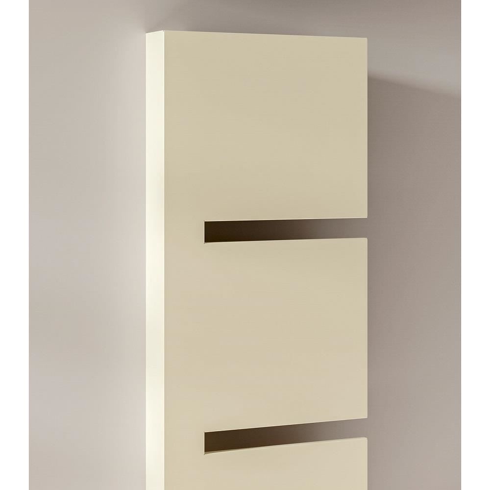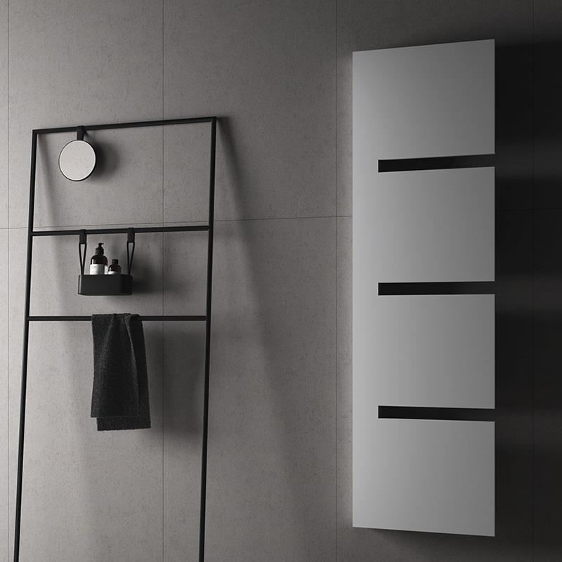 Taieturile realizate in panoul de otel rup forma dar il fac si functional, potrivit pentru o utilizare ca si portprosop. Jocul de lumini si umbre releva spiritualitatea intrinseca a acestui obiect decorativ tridimensional si sculptural.