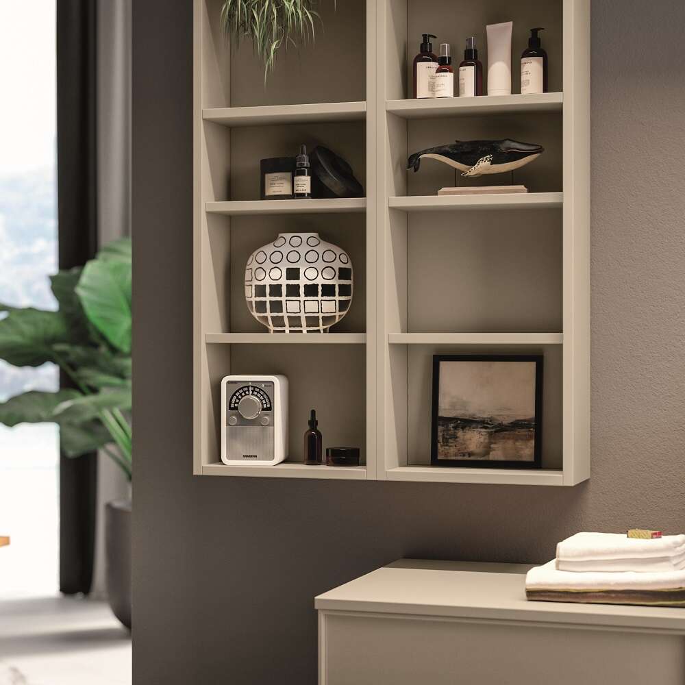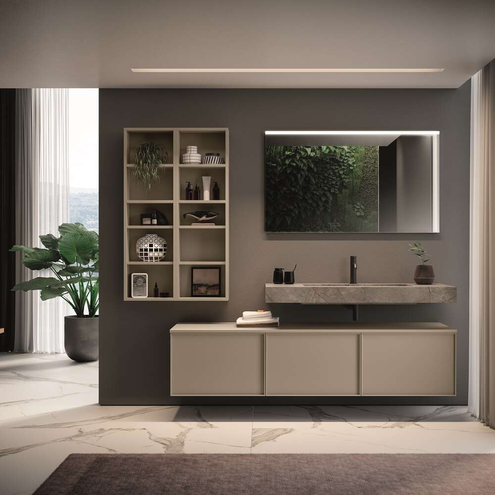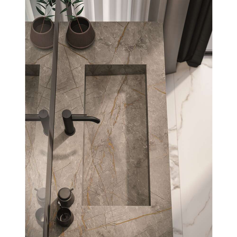In varianta din imagini avem un lavoar suspendat cu grosime 10 cm din gresie in finisaj 261 Kaspiro Oro cu lavoar integrat, mobilier sub lavoar cu 3 sertare in finisaj mat 408 Moka cu rama metalica in aceeasi culoare, oglinda cu lumina LED integrata si 2 coloane cu rafturi suspendate in finisaj mat 408 Moka.