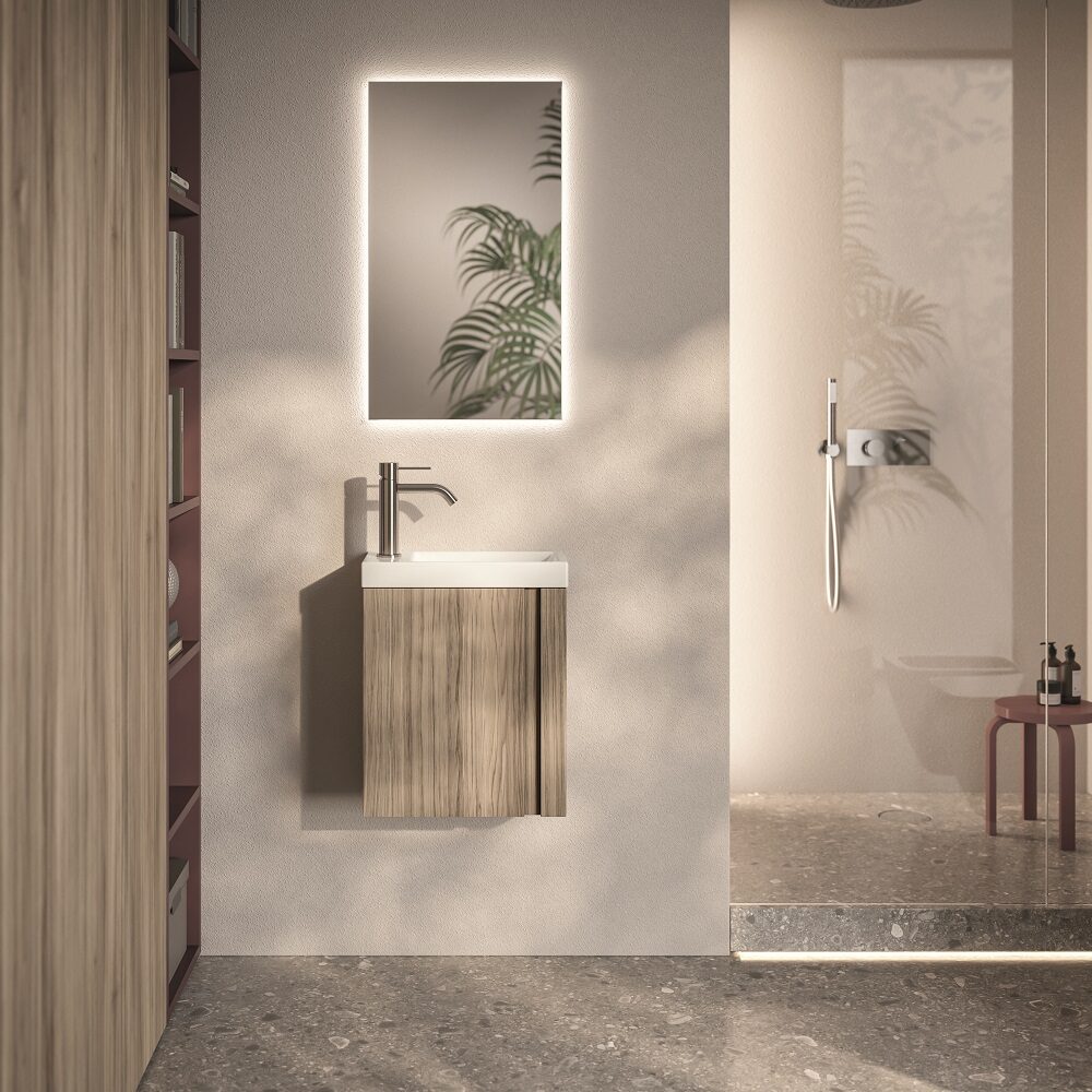 In varianta din imagini avem un mobilier sub lavoar suspendat, cu 1 sertar exterior si 1 interior, si coloana suspendata, ambele cu front in finisaj lemn 937 Rovere Elegance cu manere albe si laterale in finisaj 417 Latte matt, lavoar ceramic in finisaj alb mat si oglinda cu iluminare LED.