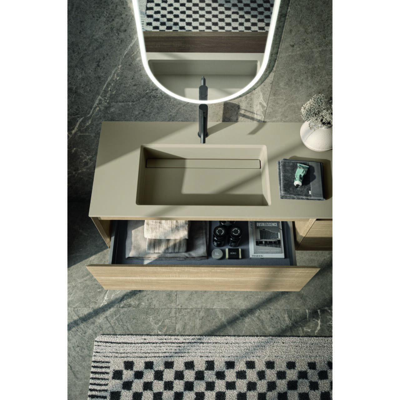 In varianta din imagini avem un mobilier sub lavoar suspendat, cu 1 sertar exterior si 1 interior, si coloana suspendata, ambele cu front in finisaj lemn 937 Rovere Elegance cu manere albe si laterale in finisaj 417 Latte matt, lavoar ceramic in finisaj alb mat si oglinda cu iluminare LED.