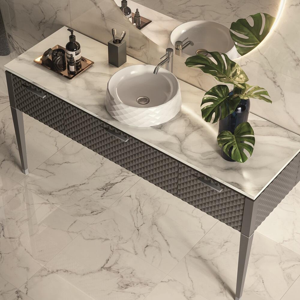 In varianta din imagini avem un mobilier sub lavoar suspendat, cu 3 sertare, cu fronturi in textura 3D Galles si culoarea in finisaj lucios 404 Metropoli, cu manere, detaliu sub blat si ornamente picioare in finisaj cromat, blat din gresie 329 Statuarietto ce imita marmura, cu lavoar ceramic alb lucios montat pe blat, oglinda rotunda cu lumina LED ambientala.
