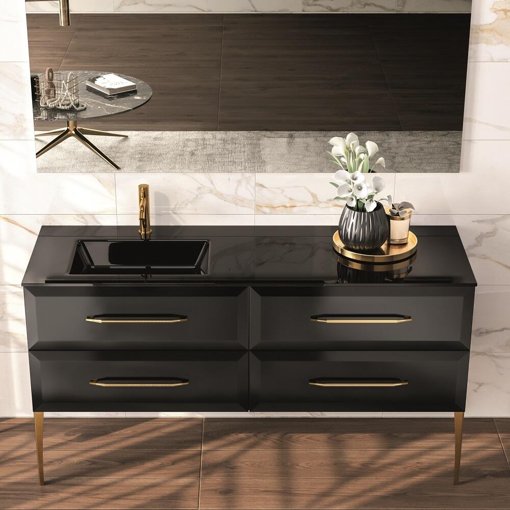 In varianta din imagini avem un mobilier sub lavoar cu 4 sertare si blat cu lavoar integrat in finisaj negru lucios 433 Nero, manere aurii cu cristale Swarovski si picioare in finisaj auriu, oglinda de dimensiuni mari cu aplica cu lumina LED in finisaj negru.