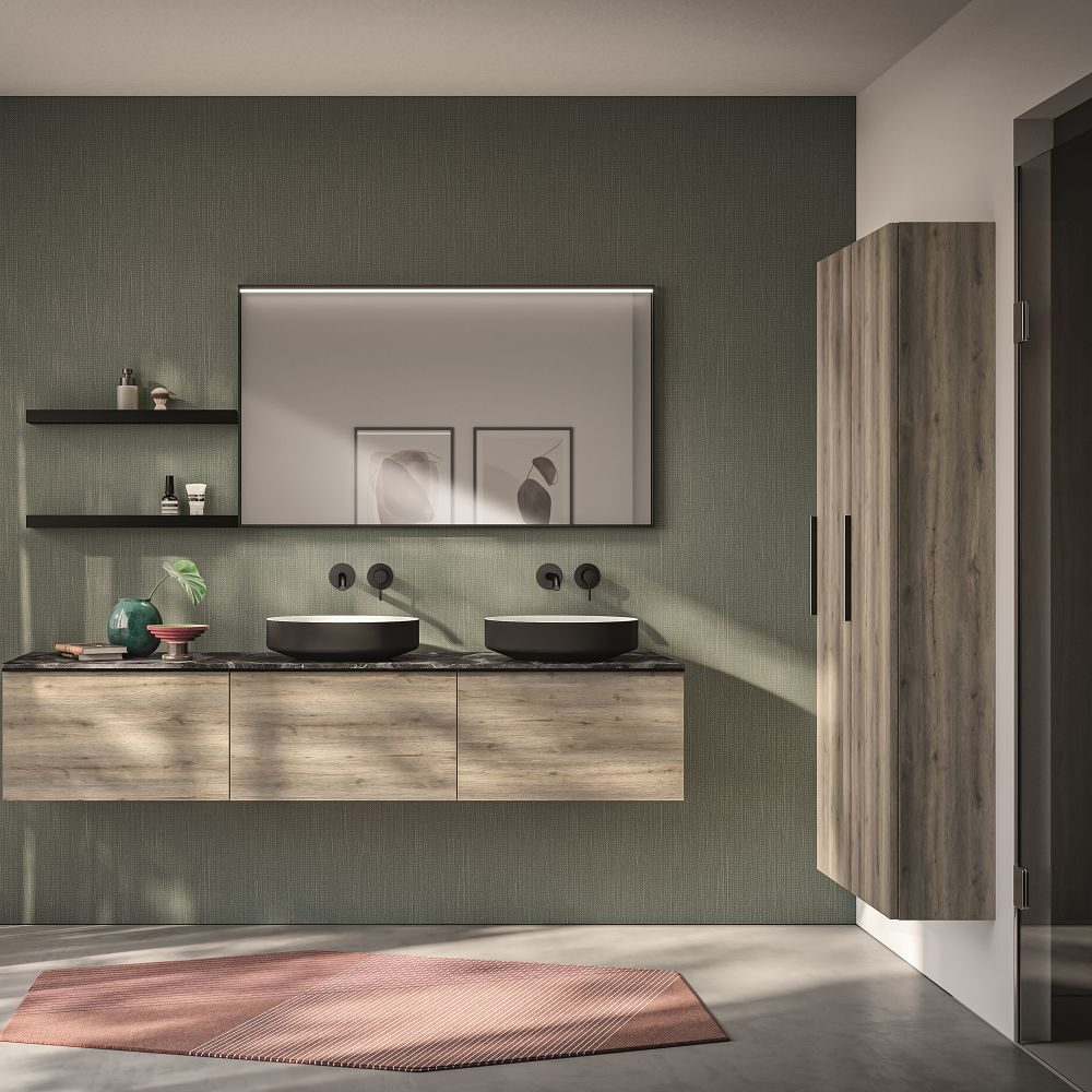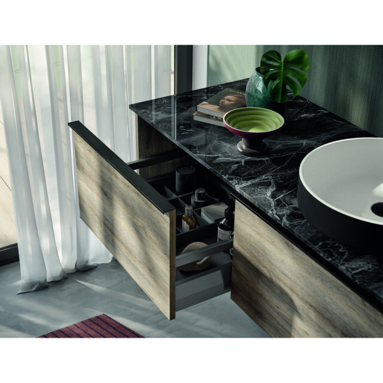 In varianta din imagini avem un mobilier sub lavoar suspendat, cu 1 sertar exterior si 1 interior, si coloana suspendata, ambele cu front in finisaj lemn 937 Rovere Elegance cu manere albe si laterale in finisaj 417 Latte matt, lavoar ceramic in finisaj alb mat si oglinda cu iluminare LED.