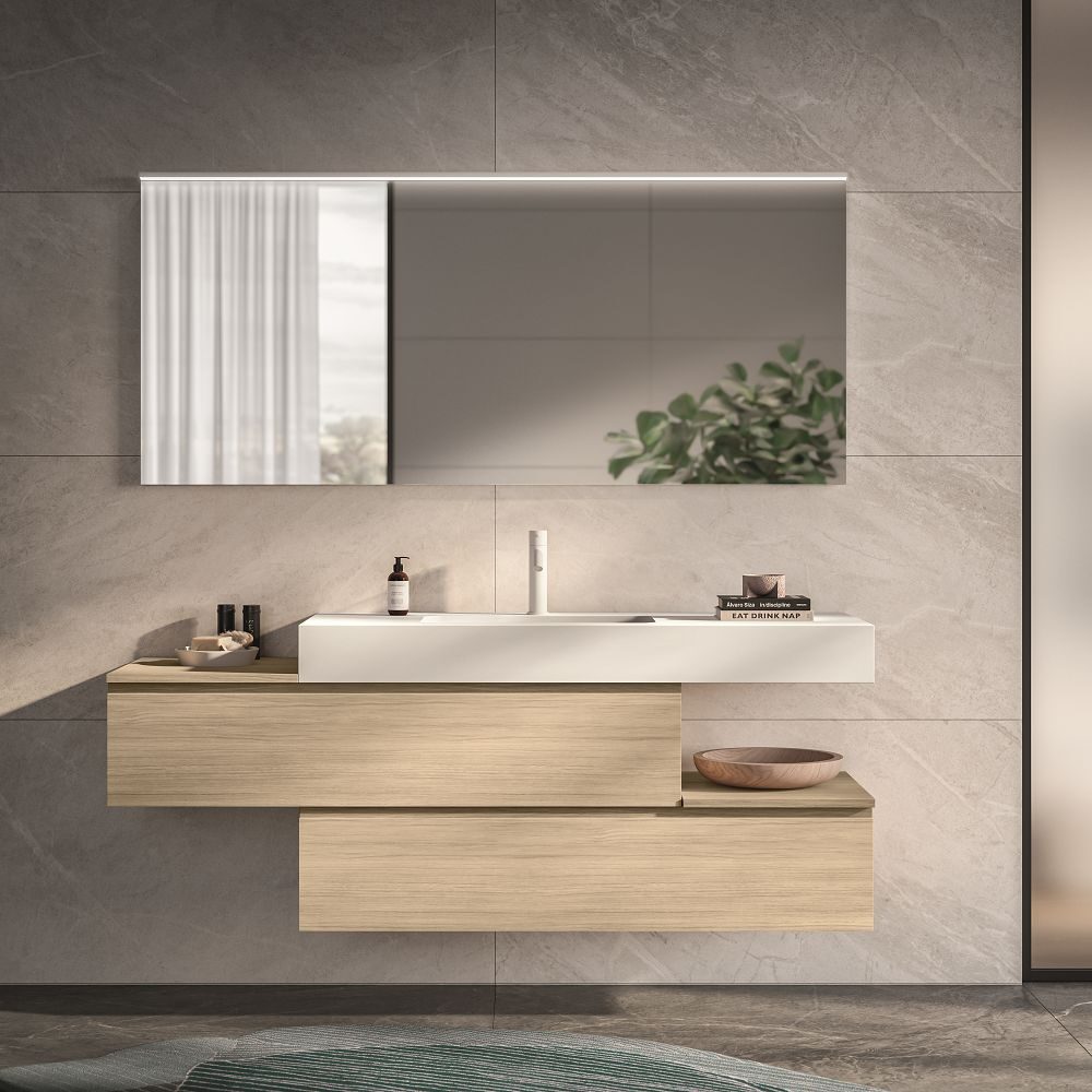 In varianta din imagini avem un mobilier sub lavoar suspendat, cu 1 sertar exterior si 1 interior, si coloana suspendata, ambele cu front in finisaj lemn 937 Rovere Elegance cu manere albe si laterale in finisaj 417 Latte matt, lavoar ceramic in finisaj alb mat si oglinda cu iluminare LED.