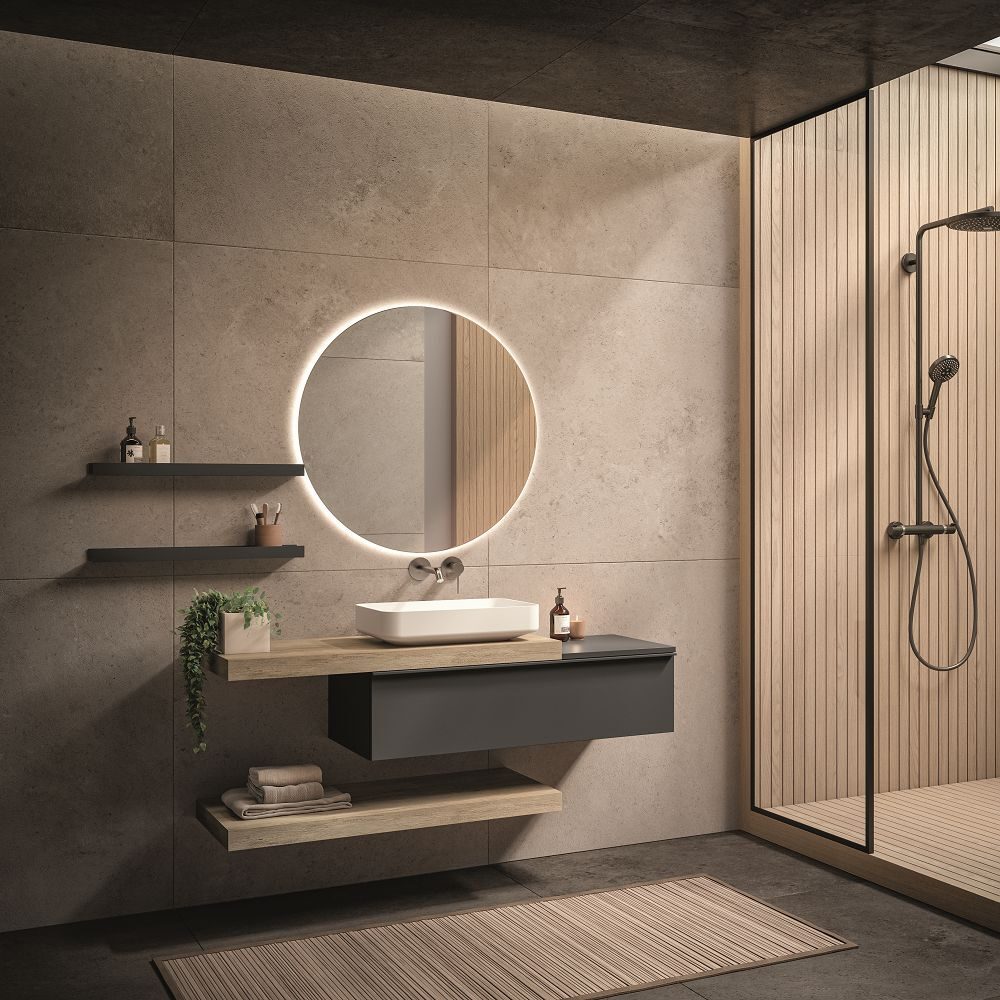 In varianta din imagini avem un mobilier sub lavoar suspendat, cu 1 sertar exterior si 1 interior, si coloana suspendata, ambele cu front in finisaj lemn 937 Rovere Elegance cu manere albe si laterale in finisaj 417 Latte matt, lavoar ceramic in finisaj alb mat si oglinda cu iluminare LED.