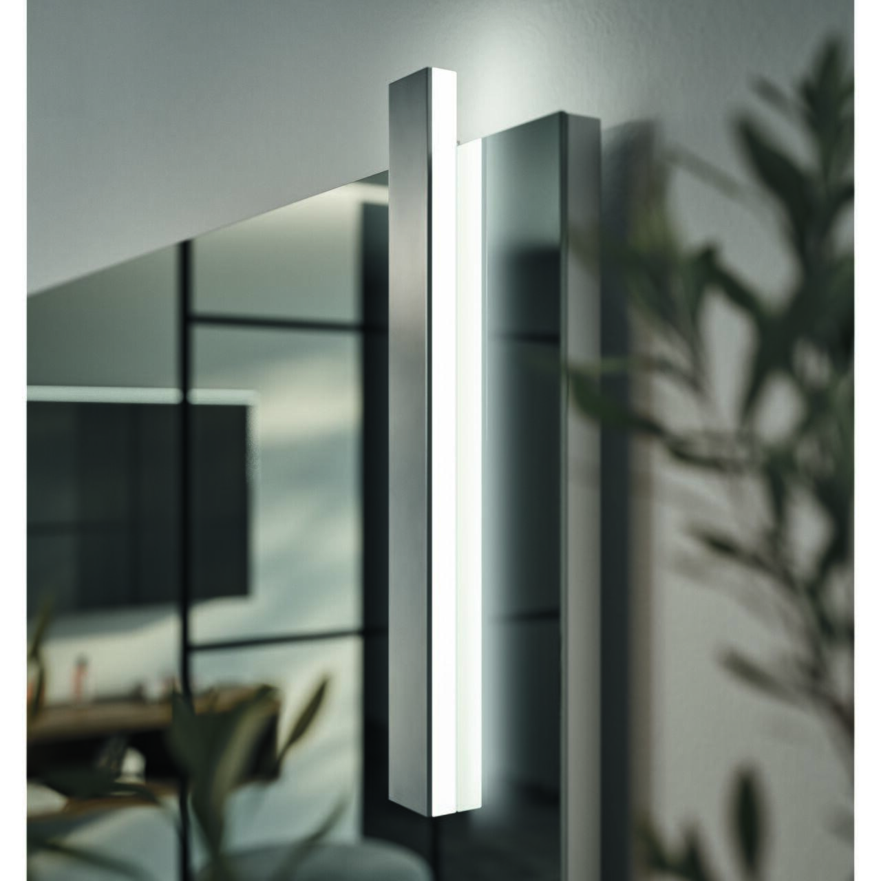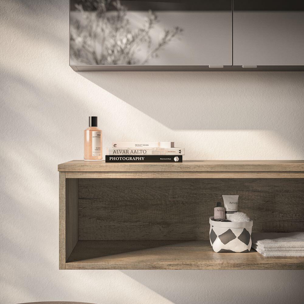 In varianta din imagini avem un mobilier sub lavoar suspendat, cu 1 sertar exterior si 1 interior, si coloana suspendata, ambele cu front in finisaj lemn 937 Rovere Elegance cu manere albe si laterale in finisaj 417 Latte matt, lavoar ceramic in finisaj alb mat si oglinda cu iluminare LED.