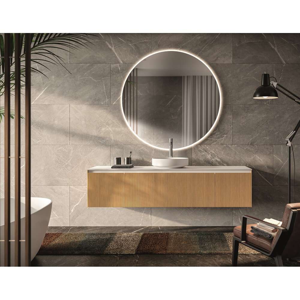 In variantele din imagini avem mobilier sub lavoar suspendat cu 1 sertar cu front din lemn masiv Rovere Oro in finisaj Cannete, laterale din lemn masiv Rovere Oro, blat din material compozit in finisaj alb mat cu lavoar pe blat diametrul 42 cm alb mat, si oglinda cu lumina LED ambientala.