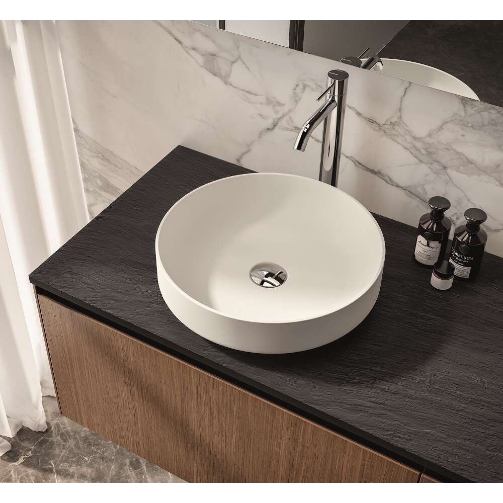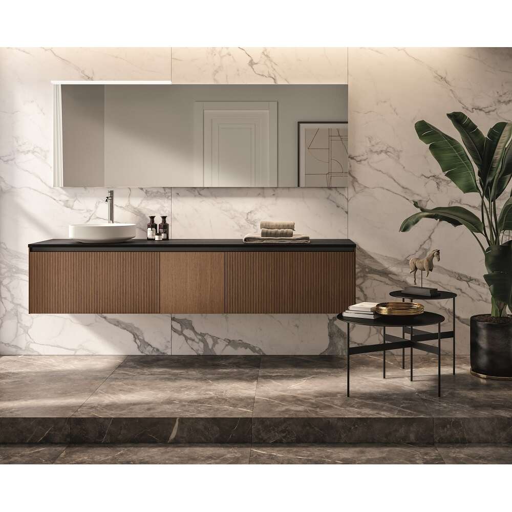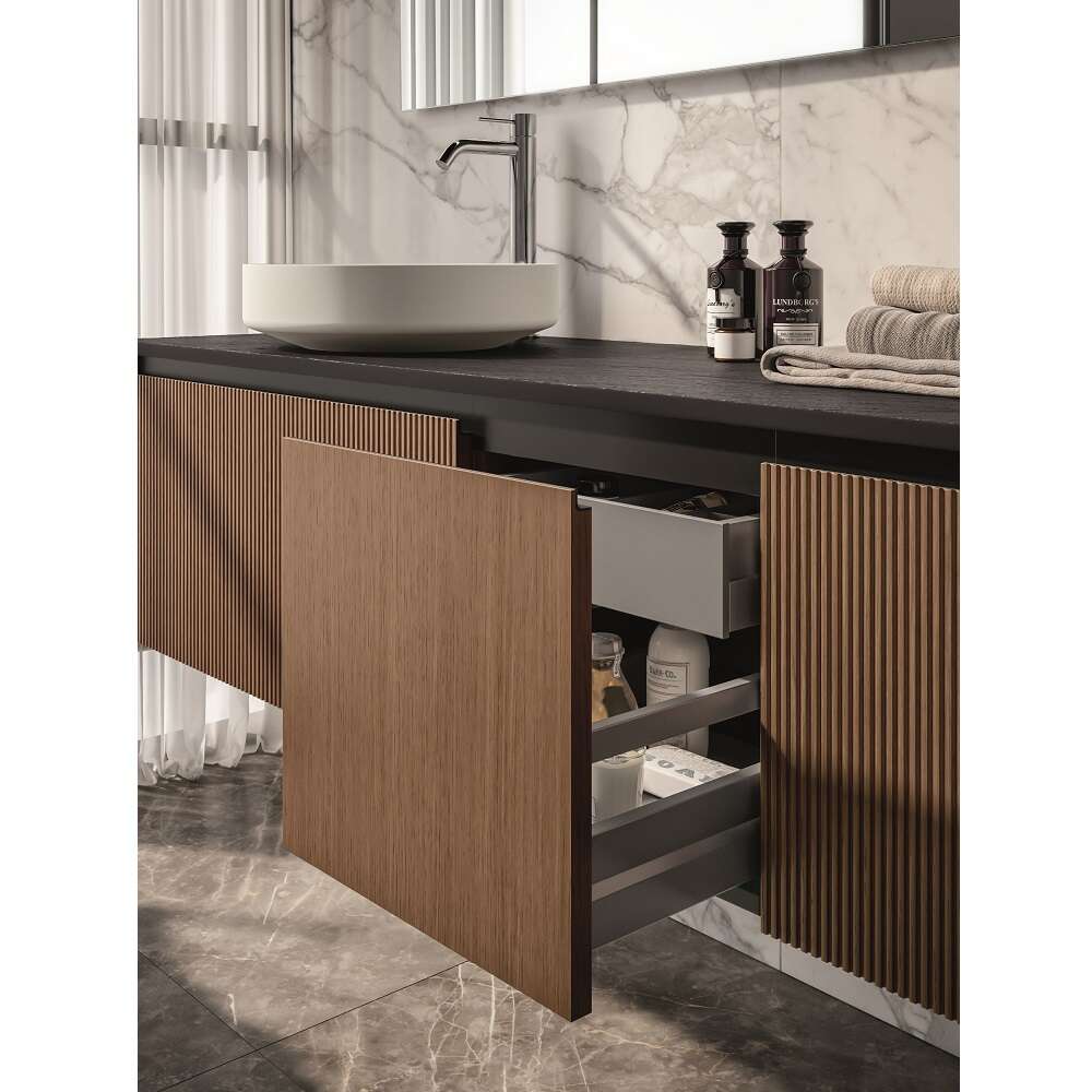 In variantele din imagini avem mobilier sub lavoar suspendat cu 2 sertare cu front din lemn masiv Noce Canaletto in finisaj Cannete si 1 sertar central cu sertar interior si laterale din lemn Noce Canaletto finisaj Satin, blat din gresie in finisaj 328 Ardesia Nera, cu lavoar rotund din material compozit asezat pe blat si oglinda cu aplica LED.