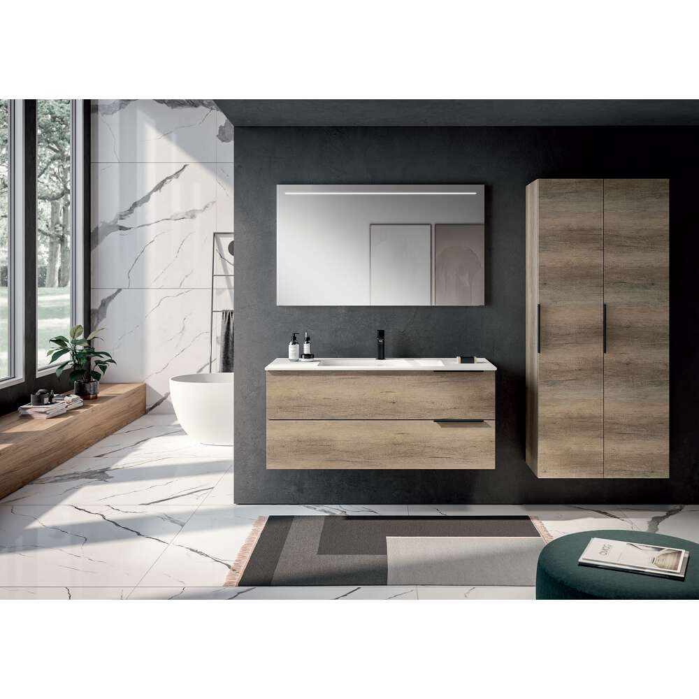 In varianta din imagini avem mobilier sub lavoar suspendat cu 2 sertare si 2 coloane suspendate, in finisajul de lemn 948 Vintage Avana cu manere negre, blat alb ceramic cu lavoar integrat si oglinda cu lumina LED.