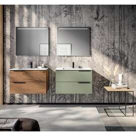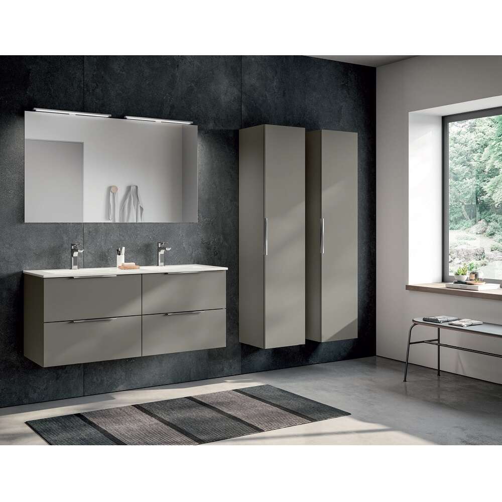 In varianta din imagini avem mobilier sub lavoar suspendat cu 4 sertare si 2 coloane in finisajul 416 Creta Mat, cu manere cromate, blat ceramic alb lucios cu 2 lavoare integrate si oglinda cu 2 aplice LED finisaj cromat.