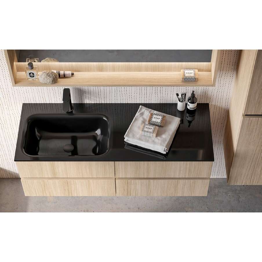 In varianta din imagini avem mobilier sub lavoar suspendat cu 4 sertare in finisajul lemn 937 Rovere Elegance cu canelura negru mat, blat din sticla negru mat (frosted glass) 433 Nero cu lavoar integrat si oglinda cu lumina LED si etajera.