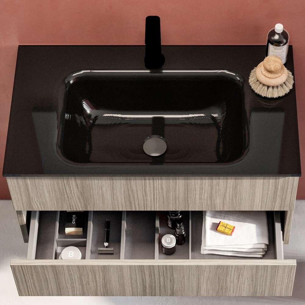 In varianta din imagini avem mobilier sub lavoar suspendat cu 2 sertare si 1 coloana in finisajul lemn 935 Rovere Titanio, canelura in finisajul 433 Nero Matt, blat din sticla negru mat (frosted glass) cu lavoar integrat si oglinda cu lumina LED.