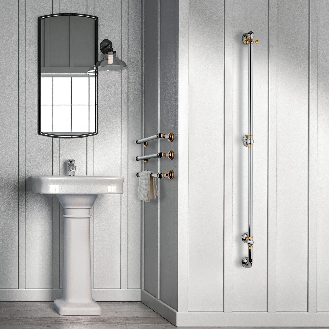 Margaroli ne prezinta un calorifer portprosop electric din colectia Armonia, in finisaj elegant cromat, cu detalii aurii, pentru o baie rafinata.
