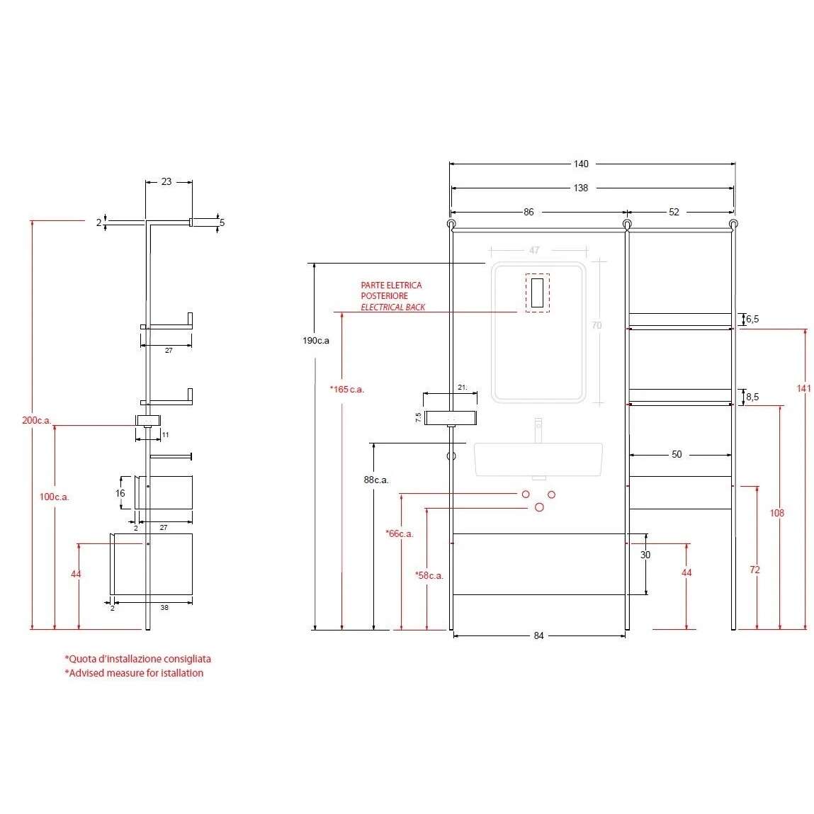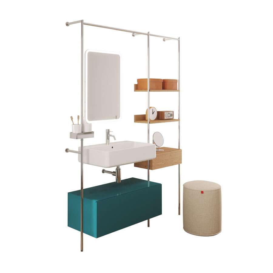 Conceptul a luat nastere plecand de la o structura de otel, in finisaj negru mat sau cromat, la care s-a adaugat mobilierul de baie in diverse culori si finisaje. La acestea se adauga elemente perfect integrate estetic precum taburetul, oglinda cosmetica pentru machiaj, suportul pentru periute de dinti.