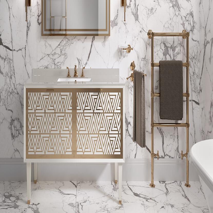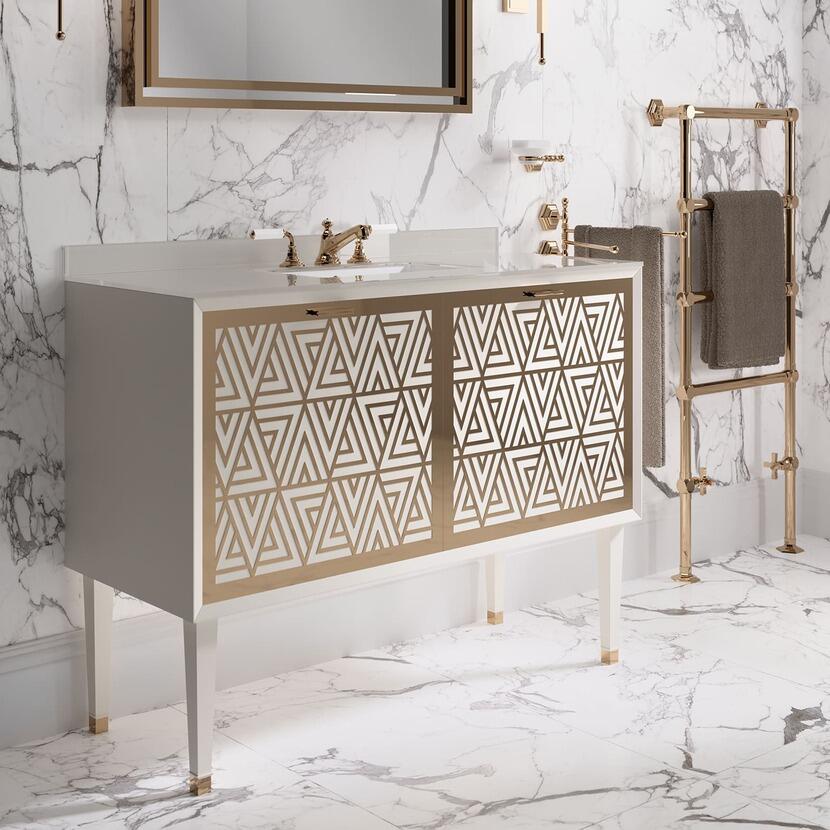 Formele geometrice cu linii elegante caracterizeaza decoratiunile metalice ale colectiei de mobilier de baie lux Cora. Pentru frontul mobilierului avem 4 variante de design - Bond, Strip, Diamond si Intrigo – care fac din acesta elementul distinctiv. Iar aceste decoratiuni metalice sunt disponibile in toate finisajele metalice din catalog.
